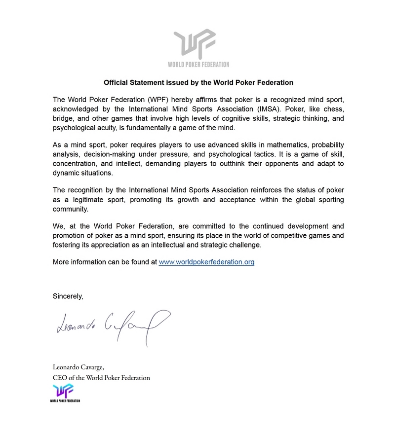 Poprzez nasze globalne wysiłki, WPF dąży do wzmocnienia pozycji graczy, federacji i interesariuszy, zapewniając, że poker jest rozpoznawany nie tylko jako konkurencyjny sport umysłowy, ale także jako narzędzie rozwoju intelektualnego i źródło pozytywnego wpływu na kulturę.