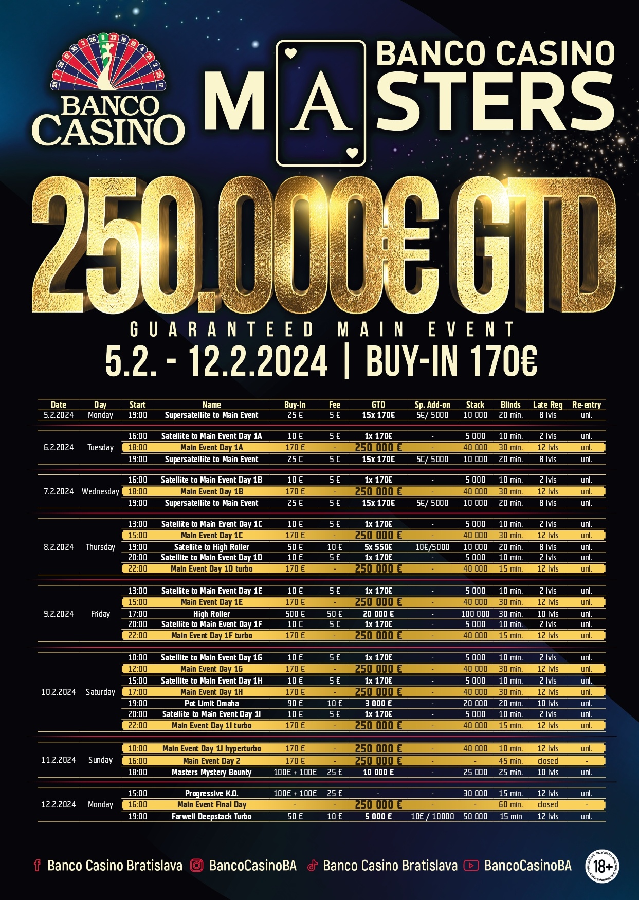 W tym roku również zapowiada się bardzo ciekawy festiwal. Main Event rozpocznie się 6 lutego, a organizatorzy przewidzieli w harmonogramie imprezy aż dziesięć dni startowych, w tym trzy turbo i jeden hyper turbo. Wpisowe do eventu wyniesie 170€, a każdy z graczy będzie miał do dyspozycji nielimitowane re-entry. Na starcie zawodnicy dysponować będą stackiem w wysokości 40.000 żetonów, a późna rejestracja potrwa aż 12 poziomów blindów. Levele trwać będą 30 minut w dniach startowych (15 minut w dniach turbo i 10 minut w hyper turbo), 45 minut w dniu drugim i 60 minut podczas dnia finałowego 12 lutego.
