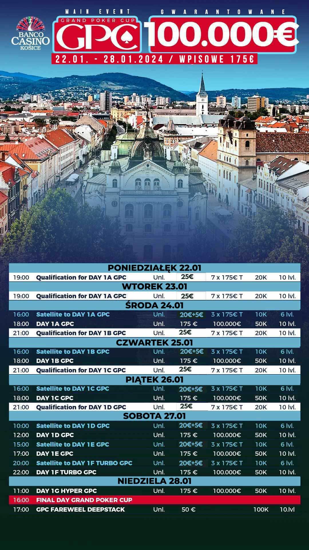 Zaraz po zakończeniu tego turnieju rozpocznie się główne styczniowe wydarzenie w Banco Casino Koszyce. Mowa o turnieju Grand Poker Cup z pulą gwarantowaną w wysokości 100.000€ i wpisowym na poziomie 175€. Dla graczy przygotowano siedem dni startowych (w tym po jednym w trybie turbo i hyper turbo). Poziomy blindów w zwykłych dniach startowych potrwają po 30 minut, a w dniu finałowym 40 minut. Stack startowy to 50.000 żetonów.