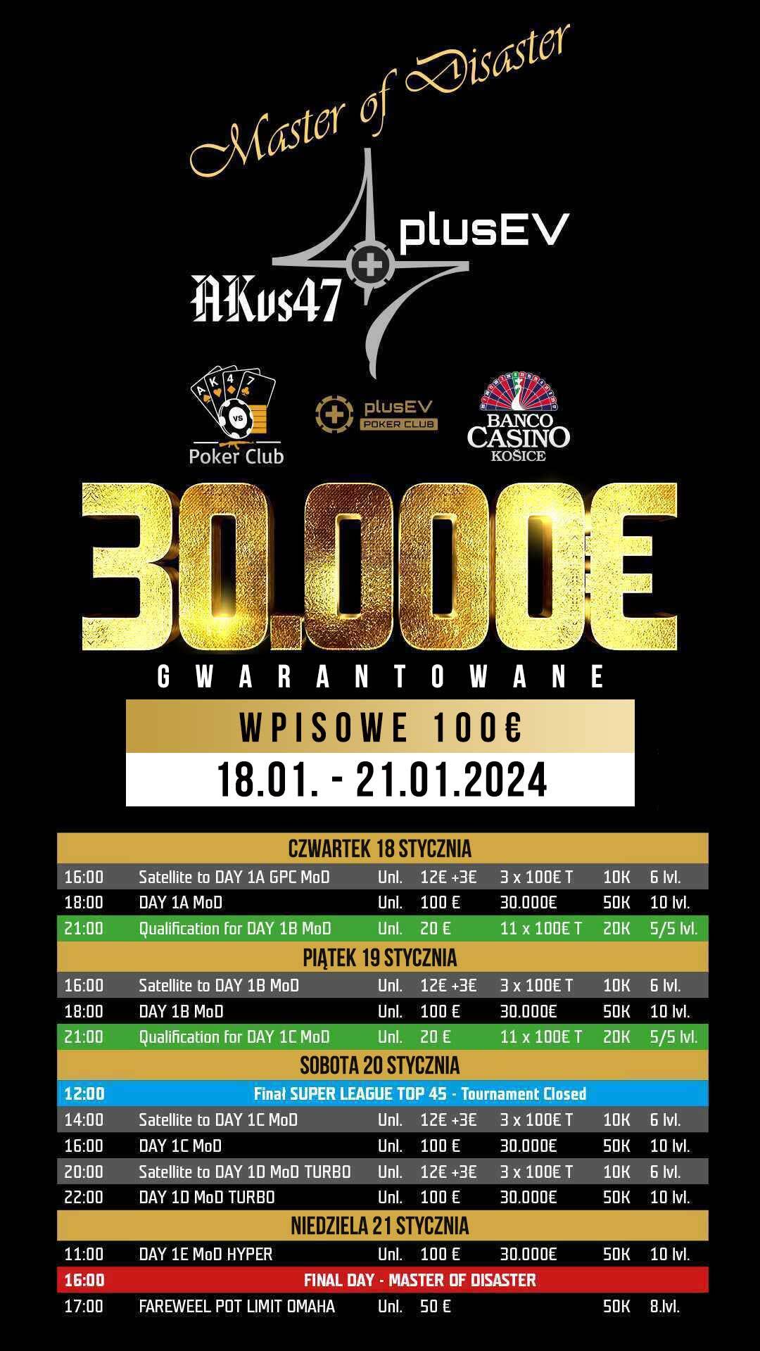 W styczniu będą kolejne okazje na polskie zwycięstwa. Najpierw w dniach 18-21 stycznia kasyno zaprasza graczy na wydarzenie pod nazwą Master of Disaster. Wpisowe do tego turnieju 100€, a pulę gwarantowaną ustalono na poziomie 30.000€. W harmonogramie mamy pięć dni startowych (trzy zwykłe z blindami po 30 minut, jeden dzień turbo i jeden hyper turbo). W dniu finałowym levele trwać będą po 40 minut. Stack startowy wynosić będzie 50.000 żetonów.