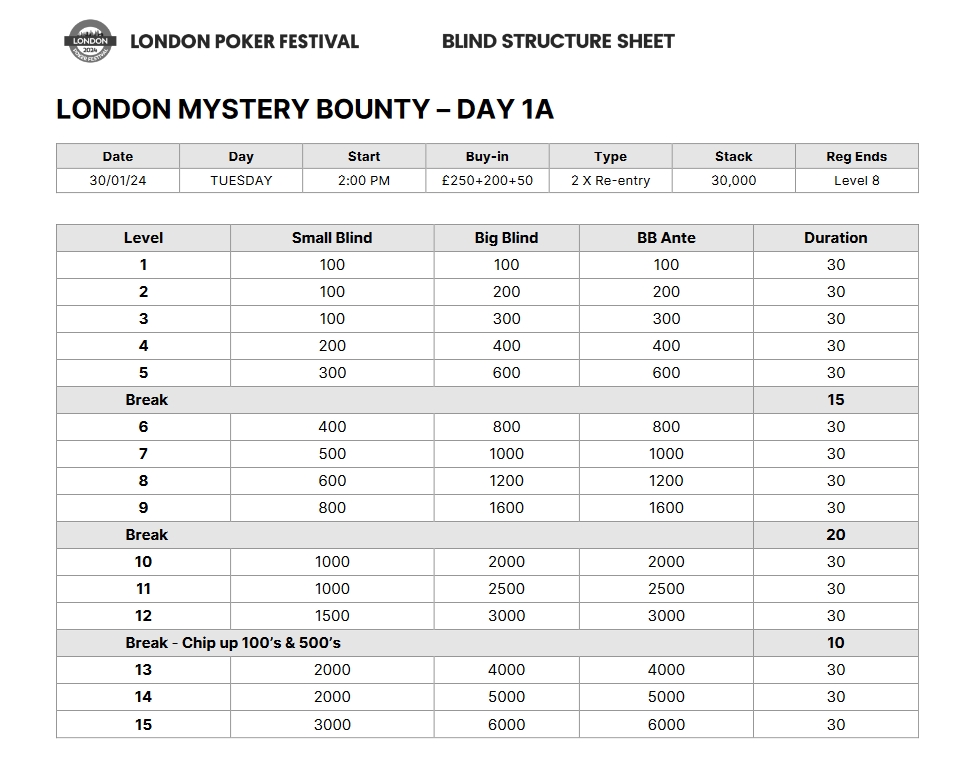 Cały festiwal składać się będzie z kilku ciekawych eventów z łączną pulą nagród gwarantowanych w wysokości 1.000.000£. Głównym wydarzeniem będzie oczywiście Main Event z wpisowym 700£ i pulą gtd w wysokości 500.000£. Każdy z graczy otrzyma na start 40.000 żetonów, levele w dniach eliminacyjnych trwać będą po 30 minut, w dniu drugim po 45 minut, a w finale po 60 minut. Późna rejestracja potrwa przez 9 poziomów blindów.