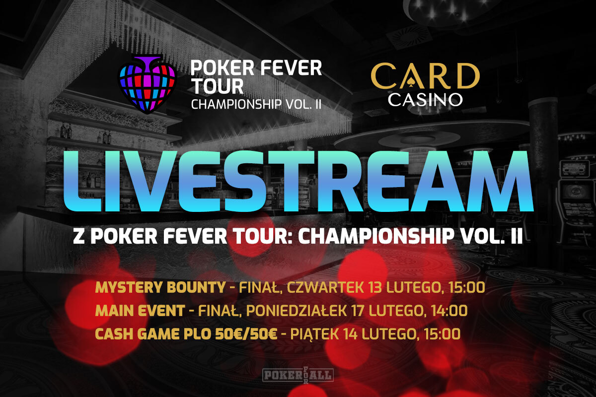 Dawno, bardzo dawno nie było livestreamu z festiwali Poker Fever, więc czas wrócić do tych dobrych czasów! W Card Casino w Bratysławie są do tego doskonałe warunki. W planach mamy więc dwa streamy z dni finałowych największych eventów - Mystery Bounty (czwartek 13 lutego o 15:00) oraz Main Eventu (poniedziałek 17 lutego od 14:00). Komentarz oczywiście w języku polskim.