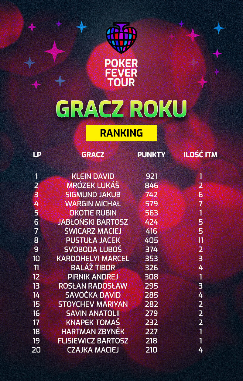 Festiwal w Bratysławie dał nam nowego lidera rankingu. Został nim zwycięzca Main Eventu, David Klein ze Słowacji, który swoją wygraną przekuł na 921 punktów do rankingu. Można jednak śmiało założyć, że zarówno on, jak i gracze z miejsc drugiego i trzeciego w tym turnieju (Rubin Okotie i Andrej Pirnik) zostaną dość szybko łyknięci przez grupę pościgową, jeśli nie pojawią się na kolejnych festiwalach Poker Fever Tour.
