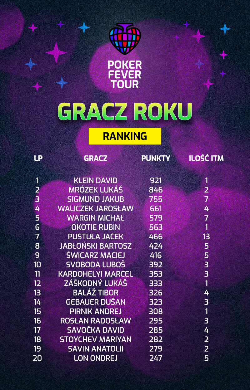 Na tę chwilę TOP50 (czyli grupę graczy z awansem do turnieju Poker Fever Tour Championship) zamykają Tomasz Kokoszka i Artur Piasecki - obaj mają po 120 punktów. Stack startowy w tym evencie uzależniony będzie od pozycji w rankingu (patrz wyżej).