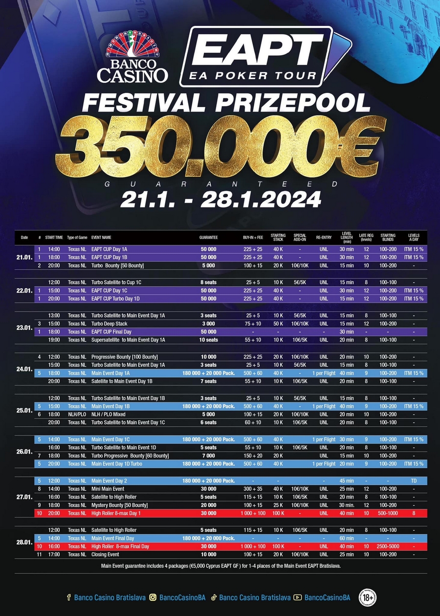 Inne ciekawsze eventy tego festiwalu to EAPT Cup z wpisowym 250€ (50k€ gtd), Mini Main Event z buy inem 335€ (30k€ gtd), High Roller za 1.100€ (30k€ gtd) czy Mystery Bounty za 115€ (20k€ gtd). Oto szczegóły ciekawszych turniejów: