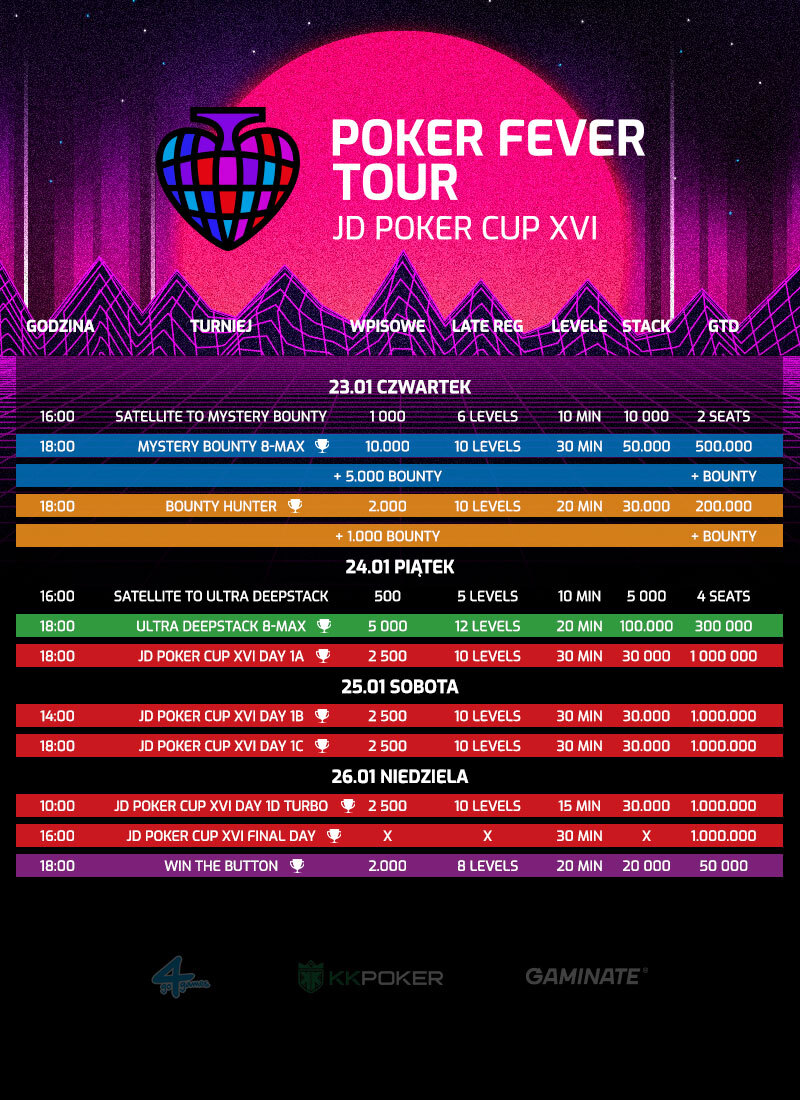 Pełny harmonogram festiwalu Poker Fever Tour: JD Poker Cup XVI