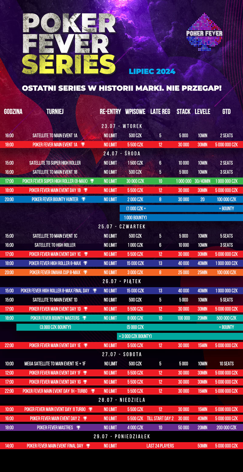 Na lipcową imprezę przygotowaliśmy trochę inny harmonogram niż na poprzednich Series. Czekać na Was będzie siedem eventów i bardziej rozbudowany Main Event. Tym razem odbędzie się aż dziewięć dni startowych (w tym trzy razy w wersji turbo) i z pewnością każdy znajdzie czas, aby zagrać swój flight. Wpisowe pozostaje bez zmian i wynosić będzie 5.500 koron. Późna rejestracja potrwa aż do rozpoczęcia dnia drugiego turnieju głównego. Poziomy potrwają 30 minut w dniach startowych (15 minut w turbo), w dniu drugim 40 minut, a w dniu finałowym 50 minut. Stack startowy to jak zawsze 30.000 żetonów.