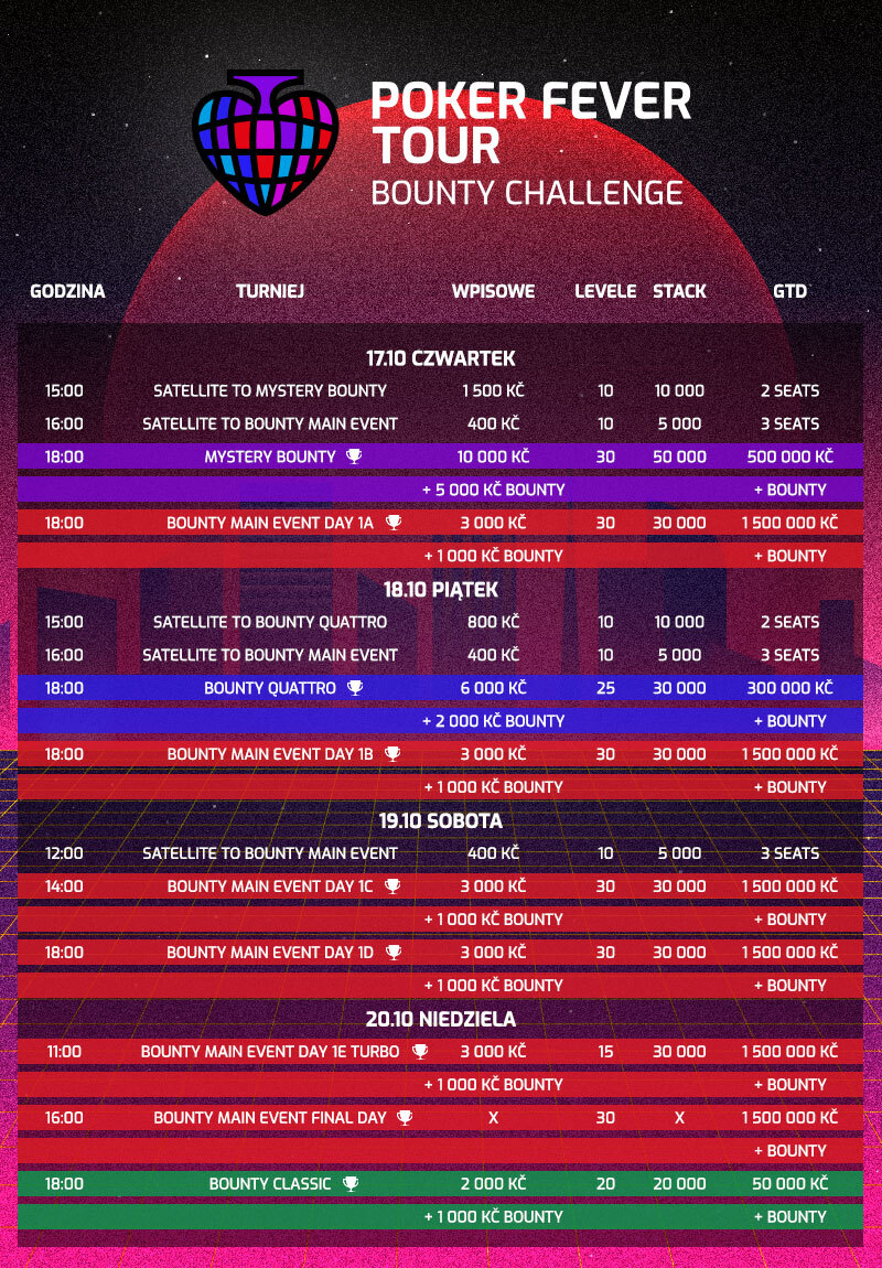 Bounty Main Event będzie rozgrywany z klasycznym bounty za każdą eliminację. W gwarantowanej puli nagród znajdzie się 1.500.000 koron + bounty. Zaplanowaliśmy pięć dni startowych, w tym jeden w formule turbo.
