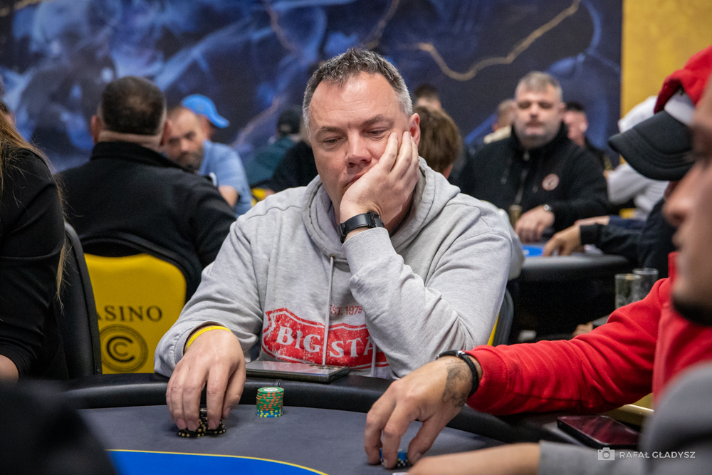 Poległ Marek, który po openie i callu wsunął 70k z damami i dostał call od pierwotnego agresora z KT w rękach. Spadł król i Marek już siedzi w dniu 1F turbo.